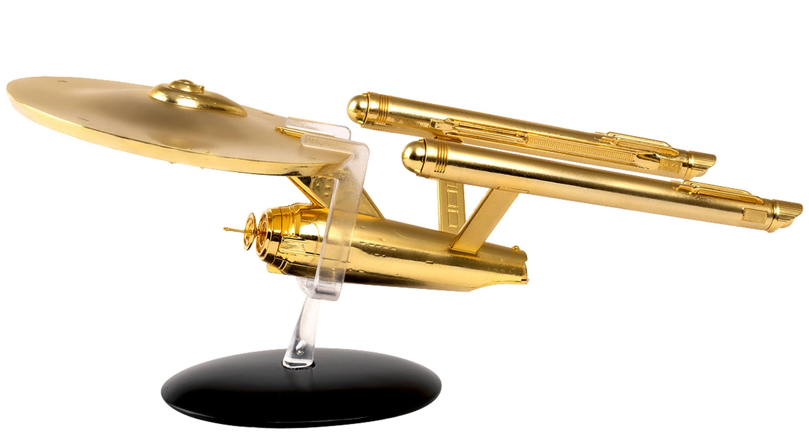 Eaglemoss have revealed their fourth gold plated starship model. Coming in July is the XL edition of the TOS version of the USS Enterprise, plated in 18 karat gold(ad), and new variant of the existing XL USS Enterprise model(ad). Continue below to check out the model, and for a look at some other gold versions of the ship!